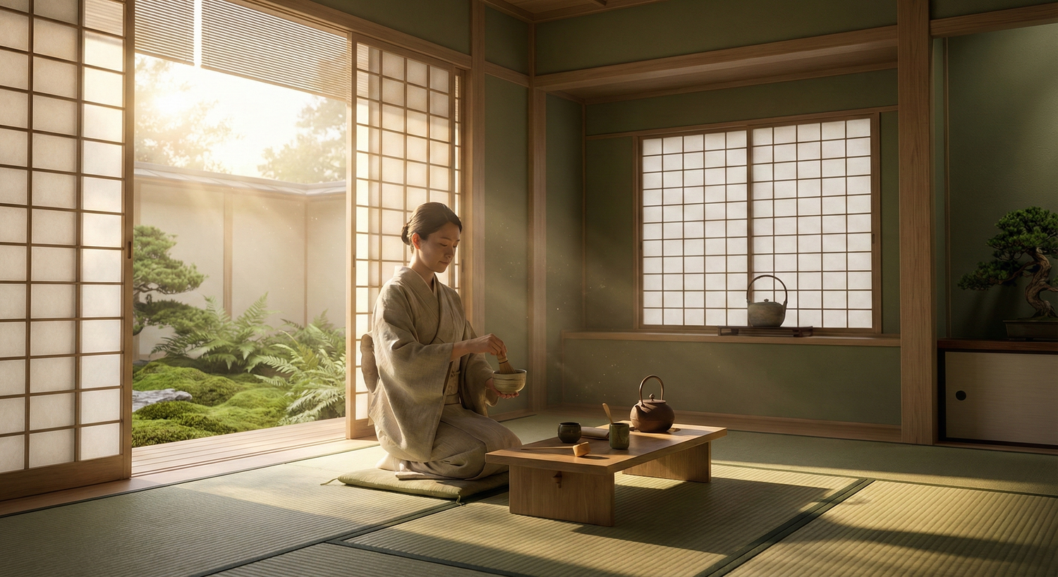 A serene, soft-lit Japanese-inspired interior with morning sunlight through shoji windows, a peaceful atmosphere, a person seated quietly in a meditative posture preparing matcha in a traditional bowl (no cup-holding close-ups), balanced green tones, calming zen mood that welcomes visitors emotionally.